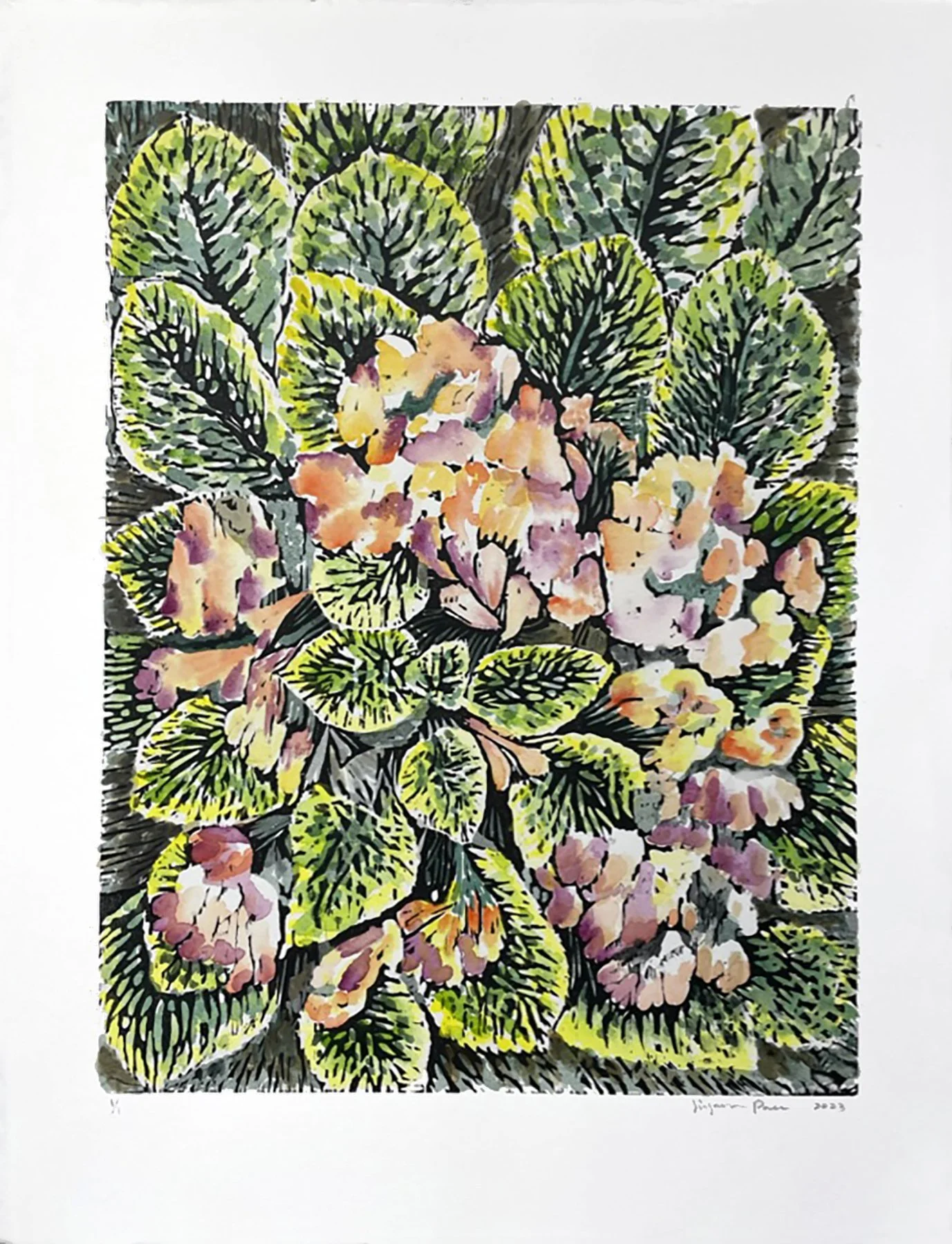 Untitled Flowers (2024), Monoprint (Linocut with watercolor addition), Image size 12 x 9 in.; paper size 14 x 10.5 in., 1/1